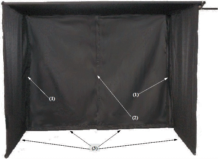 The Advantage Gripware Monitor Enclosure is made from flame retardant Super Bounce material (black inside, white outside) mounts on a 48"x48" Flag Frame (frame not included). Does not fit square tube frames. Each of the two corners (1) has Hook & Loop so that a second side can be opened if a larger viewing area is desired. In the center of the back panel (2) is an opening with Hook & Loop closure for cables to come through. A Pipe Hem (3) at the bottom of each panel is provided for the optional 3/8" stainless steel tubes, which add some weight and stability to the soft sided panels. The Monitor Enclosure offers a greater viewing area than Hoodman and is not monitor specific. Four Sided Sun Shields have a "rollup" panel.