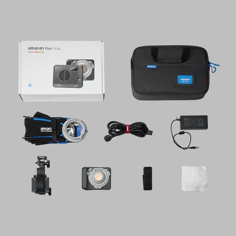The Ace Lock to Baby Pin Adapter Grip and 1/4"-20 mount give you flexibility to rig the light on stands, booms, clamps, or handheld rigs. A padded carry bag keeps the entire kit organized and ready to travel, making it easy to pack the RAY 120C as your primary key light or as a powerful, color‑capable companion to your existing kit.