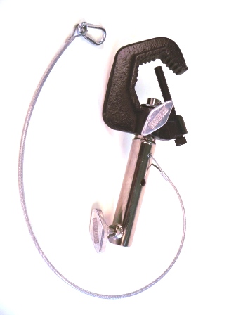 The American Grip Junior Pipe Clamp features a 1 1/8" receiver for hanging larger light fixtures, usually 2K and larger. Includes short safety cable for additional security when hanging lights from studio lighting grid. Black cast iron clamp with chrome plated receiver. Light fixture made be easily rotated into position and locked with knob.