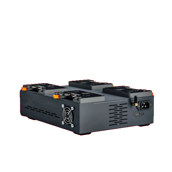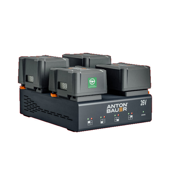 The Dionic 26V Quad Charger allows you to simultaneously charge both 14.4V and 26V Gold Mount Batteries. Anton Bauer smart charging technology can rapidly charge 26V batteries faster than standard 14.4V chargers, bringing a DIONIC 26V 98Wh battery to full charge in just 1.5hrs or DIONIC 26V 240wh battery to full charge in just 3.5 hours.