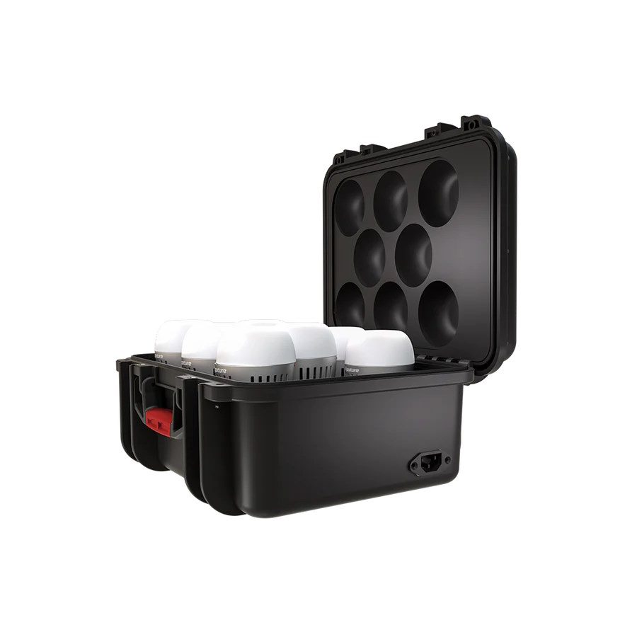 The Aputure Accent B7C RGBWW LED 8-Light Kit is a location lighting solution in a rugged carrying case. It features eight smart bulbs with a 7W output, standard E26/E27 socket, and a built-in lithium polymer battery for up to 70+ minutes at max power. With tunable CCT from 2000 to 10,000K and a high CRI of 95+ and TLCI of 96+, these bulbs offer exceptional color accuracy.