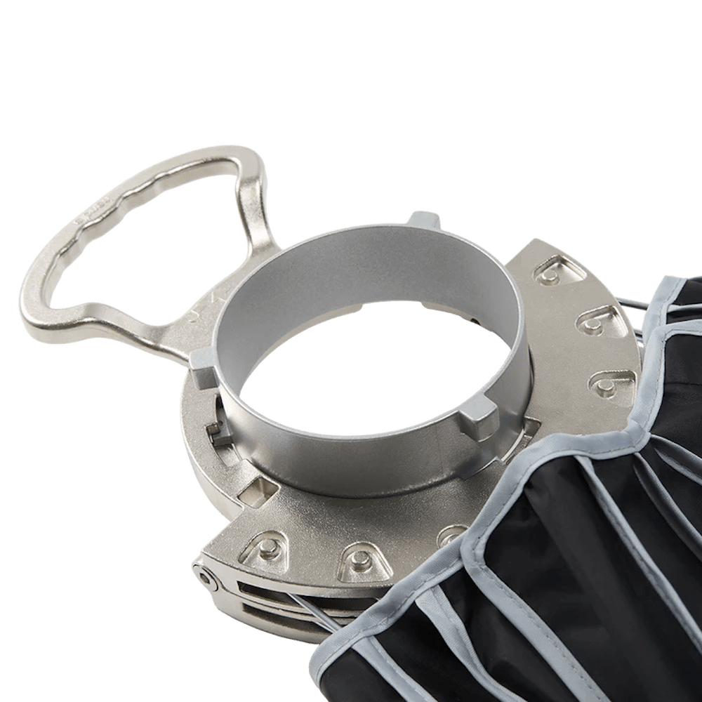 Featuring a quick release latch mounted on the speed ring, users can tension all 16 steel support rods in seconds—allowing for rapid deployment on set. A removable Bowens mount chuck makes replacements simple and efficient for long-term use.