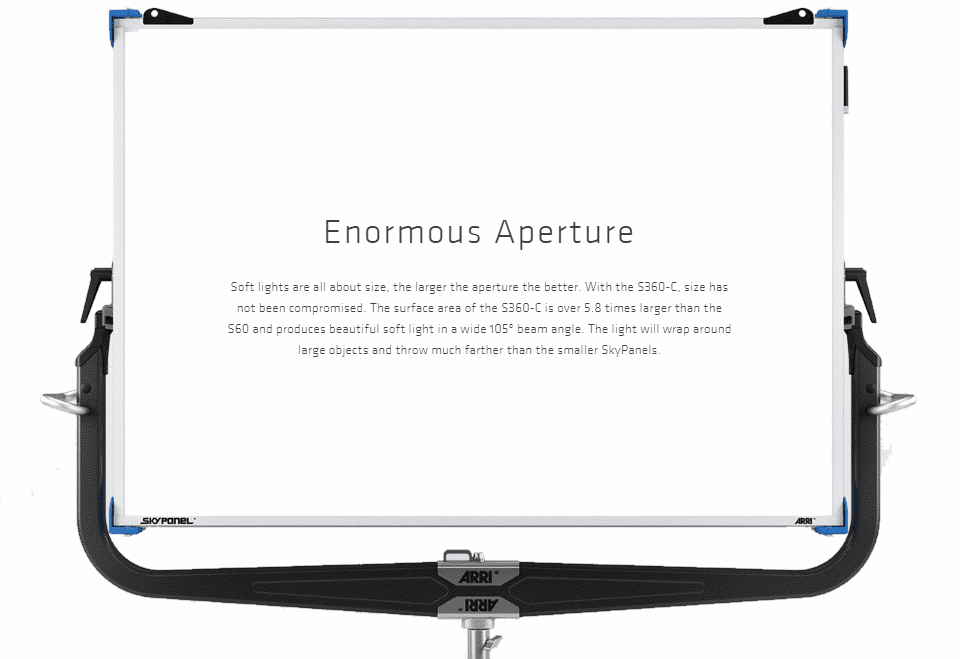 The Arri SkyPanel S360-C LED Light has raised LED lighting to a new level. German design and engineering has created blazing light output, superior color rendition and a uniform beam field, all in a compact form factor. The S360-C is one of the brightest LED soft lights on the market, providing 80 lumens per watt or 479 foot candles at 9.8ft. That's 4X brighter than an Arri S60-C, 2X as bright as a tungsten 4K soft light and 3X as bright as a 12K space light. Energy efficient, the S360 draws just 1500 watts at 120VAC. The large aperture (50.4" x 34.4"), provides a super soft light source, creating a natural wrapping light. It's like working in front of a large north light window, just beautiful light! The SkyPanel is just 7.3" deep, so it can be tucked in tight spaces on a set. No need for a softbox, but an optional DOP Snapbag is available. Not only is the S360 a powerful soft light, but it is a lighting effects tool as well. The on-board control panel gives you the ability to create Fire, Lightning, Television, Cop Car and Paparazzi effects.