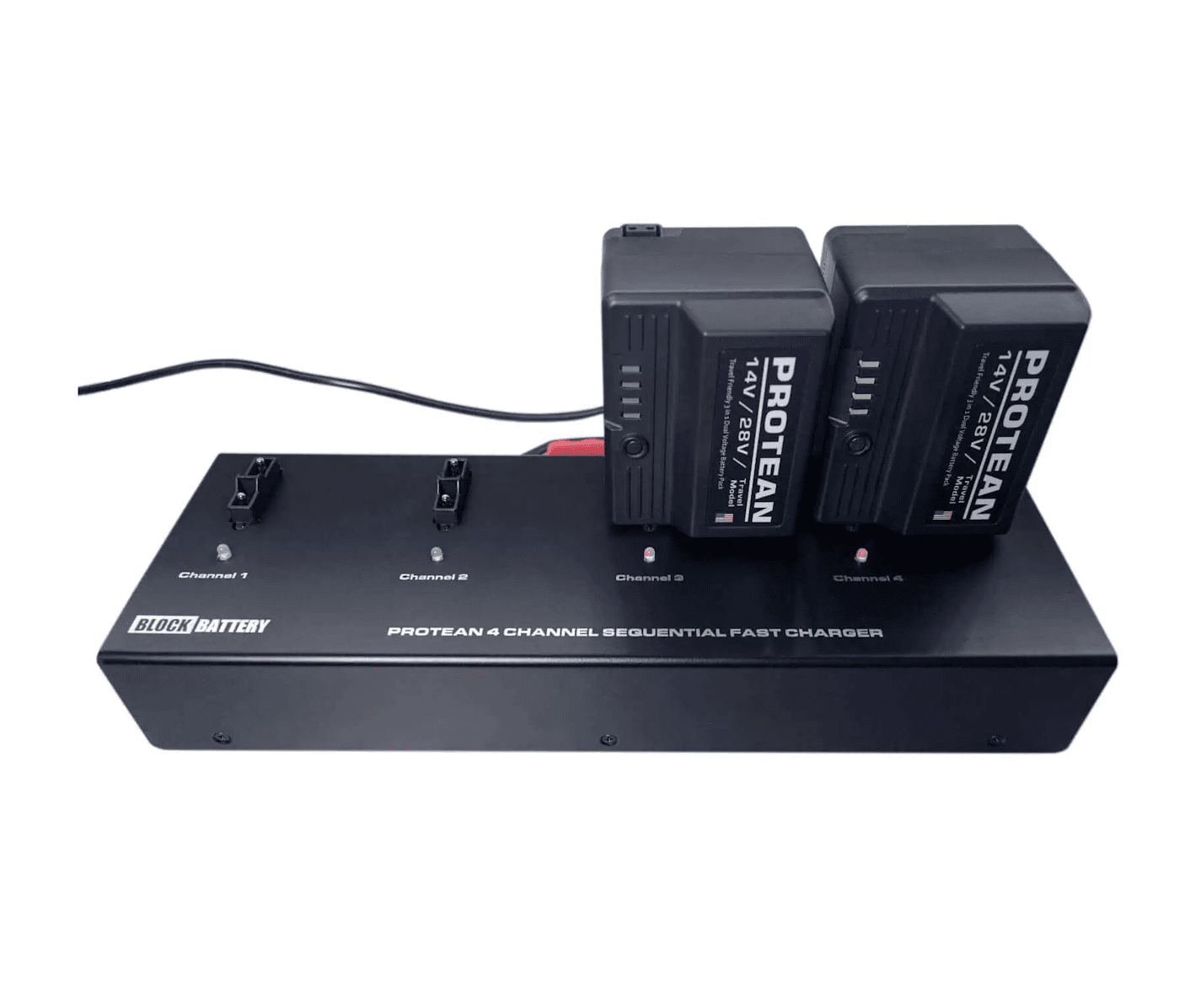 The Block Battery Protean 4 Charger is a compact 4-channel sequential fast charger designed to keep Protean camera batteries cycling continuously on busy film, TV, and commercial sets. Built for professional use, it delivers fast charge times, rugged construction, and simple operation in a space-saving footprint ideal for location work and studio carts.