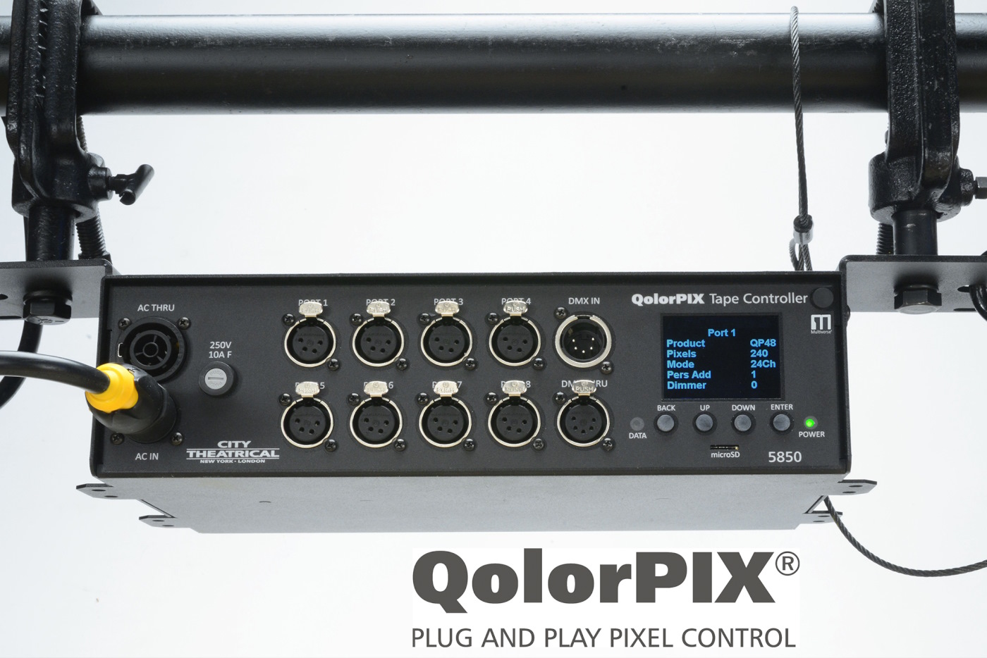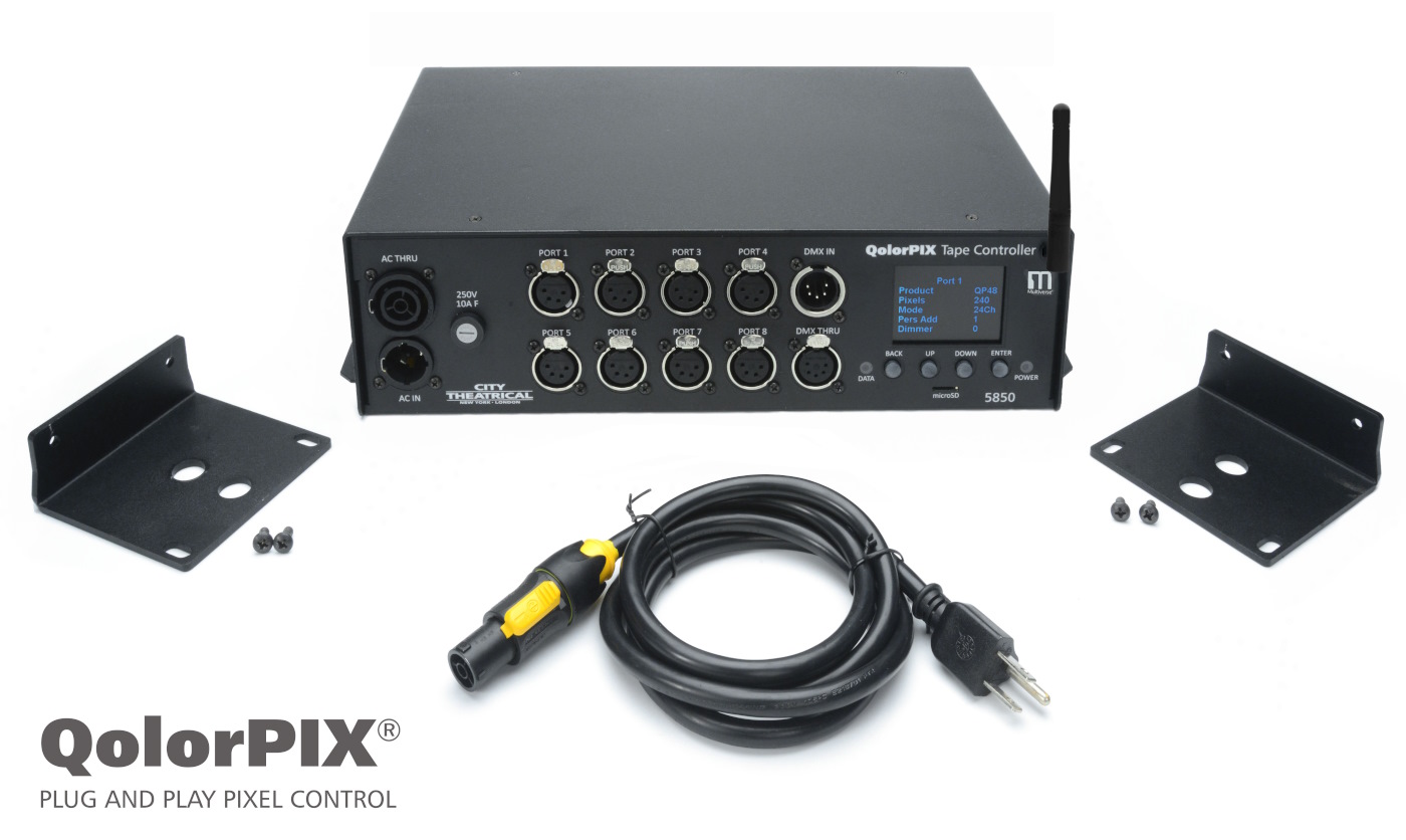 Discover the QolorPIX® Tape Controller with Eight Outputs (P/N 5850) by City Theatrical. This controller is preconfigured with personality profiles, offering thousands of dynamic effects on QolorPIX Pixel Controlled LED Tape using minimal DMX channels. Create chases, fades, scrolls, bursts, and more in minutes.
