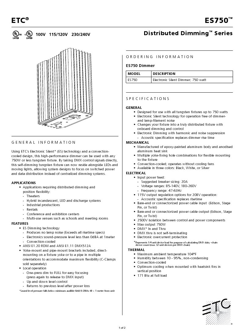 Lighting professionals around the globe have relied on ETC's dimming and power-control expertise for years. Now you can have noiseless, Sensor-quality power control right at the fixture. The convection-cooled ES750 dimmer comes with a plug that allows it to attach to any fixture up to 750W for onboard distributed power control. It comes equipped with a power input and output to a connector of your choice, and can serve as a remote dimmer for any application.