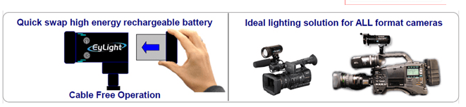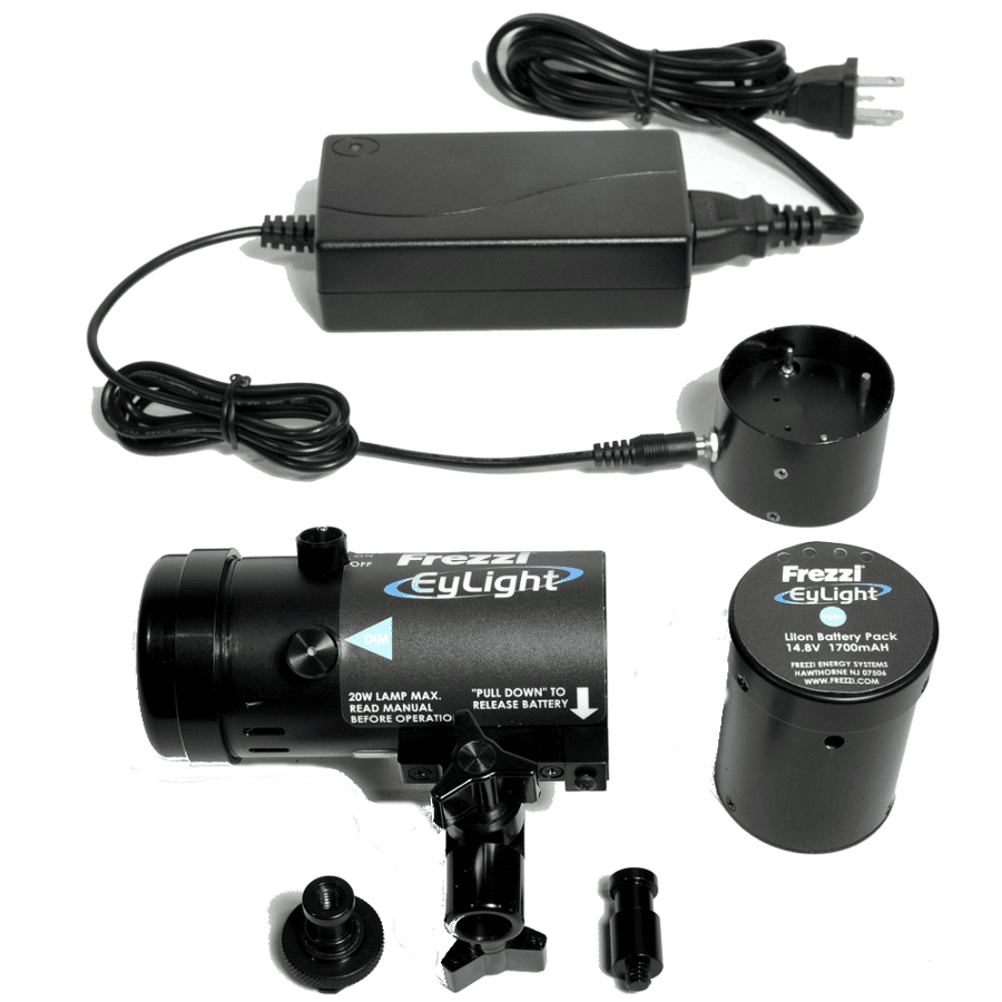 The Frezzi EyLight LED On Camera Light Kit Daylight 5000K provides 100 foot candles of output at 5ft., perfect for stand-up exterior interviews. Get that nice "eye light" in your talent's eyes with the Frezzi EyLight. The compact design can also be used on set as a hair light or to hilight background objects. The "all in one" design features a rechargeable battery pack that will run your EyLight over 2 hours. You can save a lot of money on AA batteries with the lithium ion battery and it quickly recharges in just 1.5 hours. An 8W LED light source provides the equivalent of 75W halogen lamp - 5X Brighter than your typical on camera LED light. The EyLight also accepts Tungsten LED lamps and and 20W Quartz Lamps.