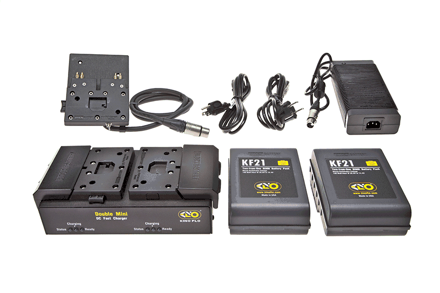 The Kino Flo Dual Block Battery System features (2) Block Batteries 140whr 28.8v and a dual position charger. The batteries are the safer NiMh chemistry which charge faster than LiOn. Dual Charger will charge 2 batteries in 1.5 hours.