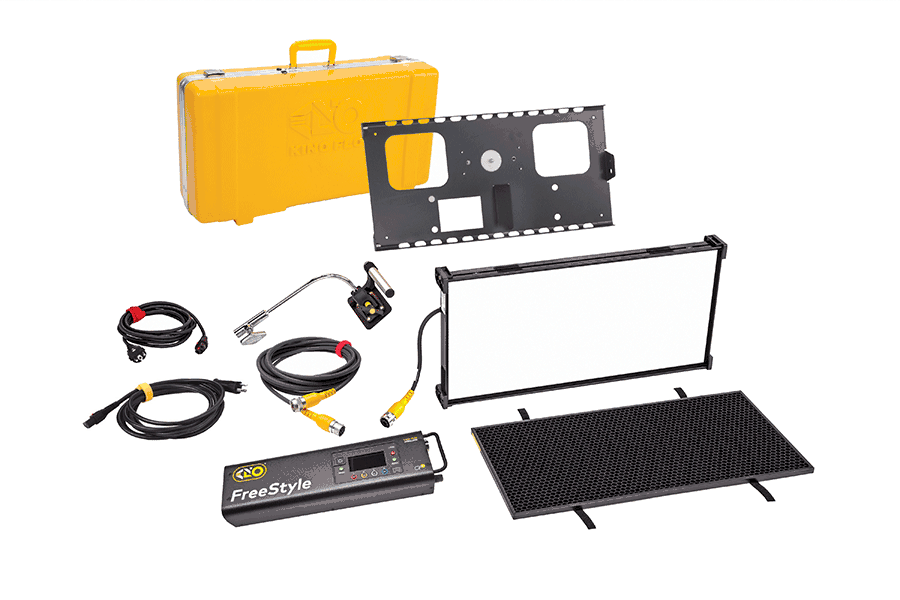The Kino Flo FreeStyle/GT 21 LED DMX Kit w/ Travel Case, Univ unleashes your creative side with a quick-release feature to remove the LED panel from the fixture, cutting the weight nearly in half (from 11.6 lbs/5.3kg to 7 lbs/3.2kg) and creating a smaller form factor for better rigging flexibility. The LED panel’s corner bumpers can be used to hang from rope or wire. The panel also takes a Twist-On mount for working on light stands. The Freestyle 21 comes complete with the full color, programmable FreeStyle controller, Head Cable (25ft), Complete Fixture with removable LED panel, and a twist-on KinoGrip Center Mount. Honeycomb 90° or 60° louvers, mounted with Velcro, give direction to the light, and when removed the panel displays a broad soft beam across the set.