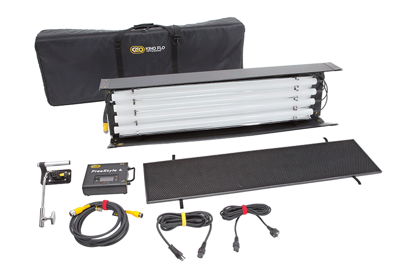 The Kino Flo FreeStyle T44 LED Tube Light Fixture 4x4 is the Kino Flo LED that everyone has been waiting for. Built with a similar design to favorite Kino 4x4 Fluorescent, but with full color 4ft RGBWW LED Tubes. The LED Tubes can be used in the fixture or outside of the fixture for even more versatility. Optional single tube header cables and splitters are available. Now you can have a complete LED system that provides beautiful LED color and Kino's True Match white light. Available menus for white light mode, gel mode, RGB mode and effects mode. Unlike competitor's models, the Kino T44 LED Tube emits light in 310 degrees and provides greater output when matched with the FreeStyle's light intensifying reflector. The fixture provides a very soft 100 degree beam pattern, similar to a 1K softlight. At 6ft, the FreeStyle T44 provides 94 footcandles of output. Even better than the original 4x4, the FreeStyle 4 has onboard DMX and Wireless DMX with Lumen Radio. The new LED Controller allows for creating special effects including candle, fire, tv, police, lightning, paparazzi, pulse and scroll. Need to run it on a battery? No problem, check out the Kino Flo 28.8V Block Battery system. Available in soft case and hard case kits.