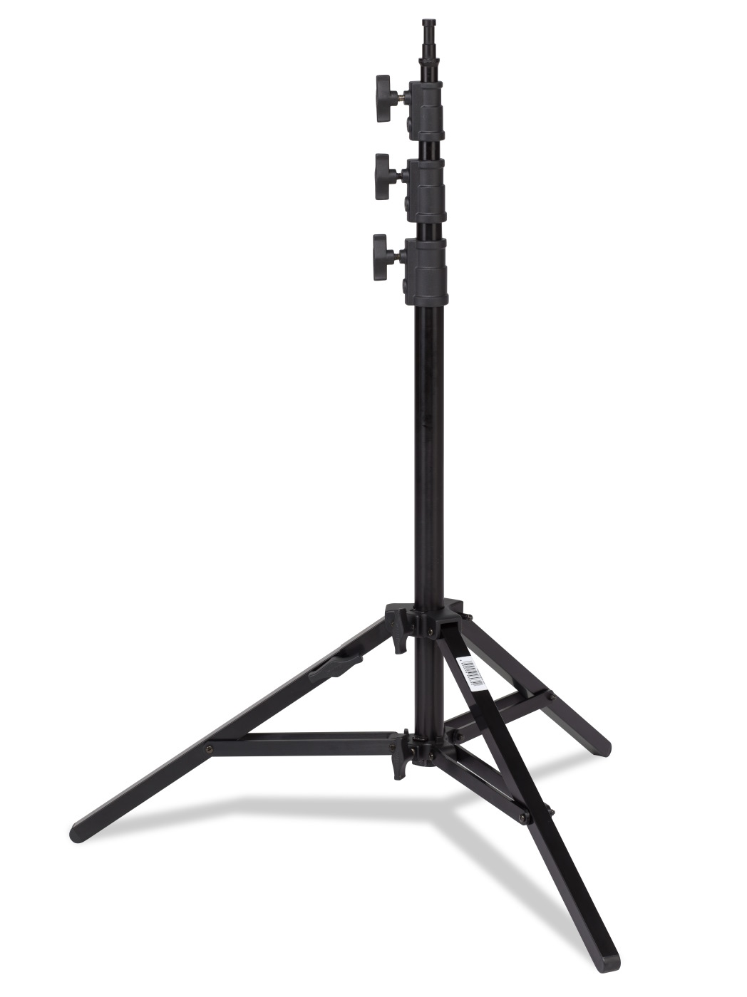 This is a premium stand with square legs for added stability and a leveling leg for uneven surfaces. Includes all metal locking collars with aluminum construction and is assembled with nuts & bolts for added durability The collapsible base has a welded 5/8" (16mm) stud attachment. It includes a sliding leg with a black finish.