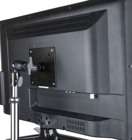 The Kupo Grip Vesa Video Monitor Mount attaches with 4 screws to rear of video monitor. Mounts on 5/8 inch diameter baby pin, found on most lighting stands and clamps. Get your monitor at just the right angle with the ability to tilt, swivel and rotate. Has both 75mm x 75mm and 100mm x 100mm mounting holes. Features double ball joint and locking handle.