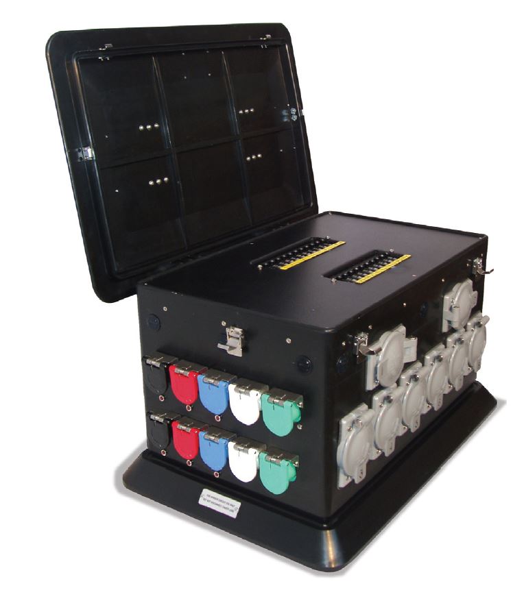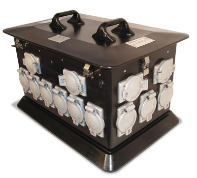 This box is used at events where portable trailers need to be powered, such as golf tournaments, autoraces, or fairs. The feed-thru allows multiple boxes set up over a wide area.