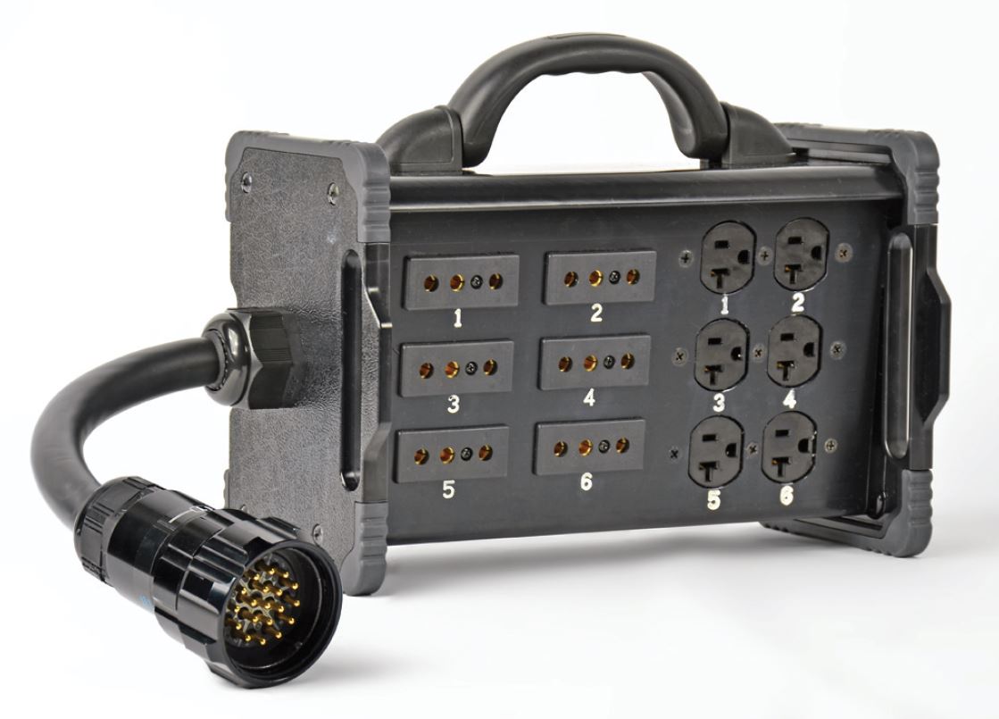 20A 6 Circuit Break Out Box, LSC19 inline Male tail to (6) 20A Stage Pin, wired in parallel to (6) 20A Edison Circuits