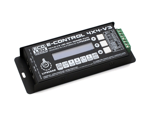 E-Control 4×4-V3.1 is an economical DMX decoder that also allows for manual control. Its lightweight and low profile lends itself to being built into nearly any rig and can adapt to many situations. It is capable of controlling multicolor LED LiteRibbon such as RGB-Amber, RGB-Tun, RGB-Day, RGB, and Hybrid (Bi-color), as well as four circuits of Single-circuit LiteRibbon.