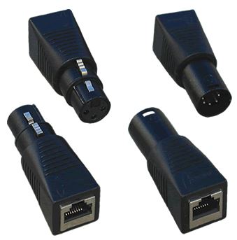 Use inexpensive RJ45 ethernet cable for DMX 512 lighting control. These rugged adapters are available in 5 Pin or 3 Pin configuration. More and more small light fixtures are using RJ45 connectors for DMX. It's great to carry a few of each adapter.