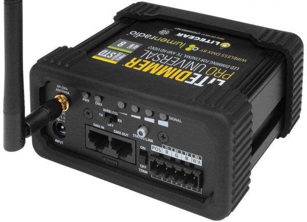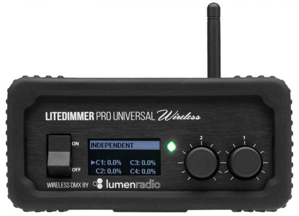 LiteDimmer Universal Wireless offers all of the same features of the LiteDimmer Universal but adds the feature of built-in wireless DMX. Using genuine Lumen Radio CRMX technology ensures compatibility with Lumen Radio CRMX and Wireless Solution W-DMX transmitters.