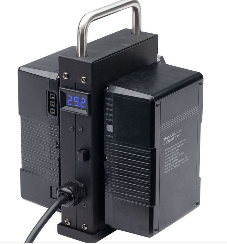 The V2 PowerStation, PL24V is a battery adapter that accepts two GOLD-Mount batteries and includes 24V (28.8V) output on a PL4 connector. It includes an integrated floor stand and Hex Pin for mounting to an optional Convi/Mafer clamp.