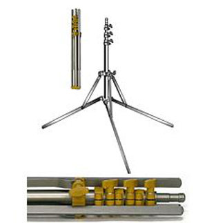 Legs can lie flat to floor or in standard tripod arrangement, and fold up for more compact packing.