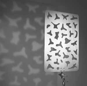 The Cucoloris, also known as a cookie, is used to create shadow patterns on backgrounds or subjects. A flatly lit wall can be broken upinto interesting pools of light and shadow. Lighting directors frequently use them to simulate sunlight filtering through trees. While the wood "cookies" create a distinctive pattern, the Cello "cookie" projects a more subtle pattern. The pattern itself depends on the distance of the light source and the distance to the background.