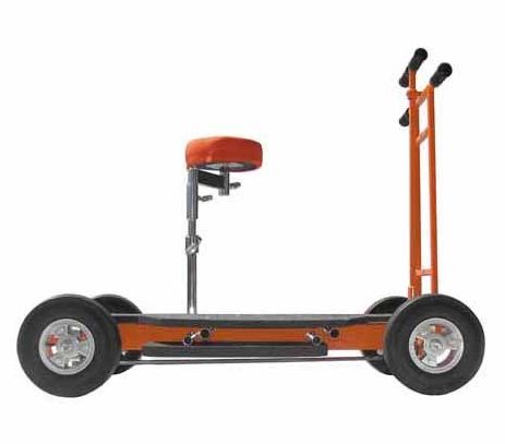 The camera operator seat will mount in six different fixed locations. Steering from both ends of the dolly will allow unlimited camera positioning as the dolly rolls on track with either Hot Buttons or the Matthews Centipede or on the ground with the standard pneumatic rubber tiers. Load capacity is over 1100 pounds (500Kg) and the platform is carpeted for a nonslip, low-maintenance surface.