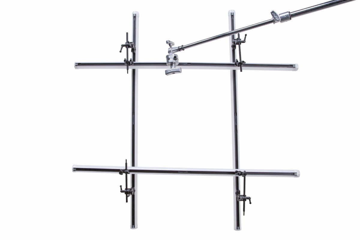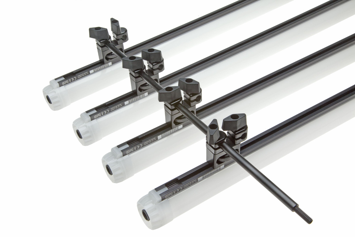 Connecting Kino Flo FreeStyle 4 LED tubes in a row or at an angle requires the MK-FS48 Spine Mount Coupler. One side attaches to the aluminum spine of the Kino Flo FreeStyle 4 LED tube and the other side has two 3/8” female receivers. Attach the Spine Mount Coupler to the aluminum spine on the FreeStyle 4 tube, tighten with the knurled thumbwheel, and connect via a Matthews 3/8” Rod to another tube with another MK-FS48 Spine Mount Coupler. Continue doing this until you have the design you want and then use the MK-FS48 Spine Mount Rod 4” to attach your lighting rig to a grip head.