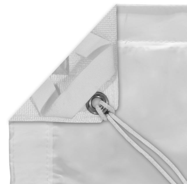 Fabric features nylon webbing along perimeter with grommets and string ties for attaching to frame. Strectch elastics in 4 corners for quick mounting.