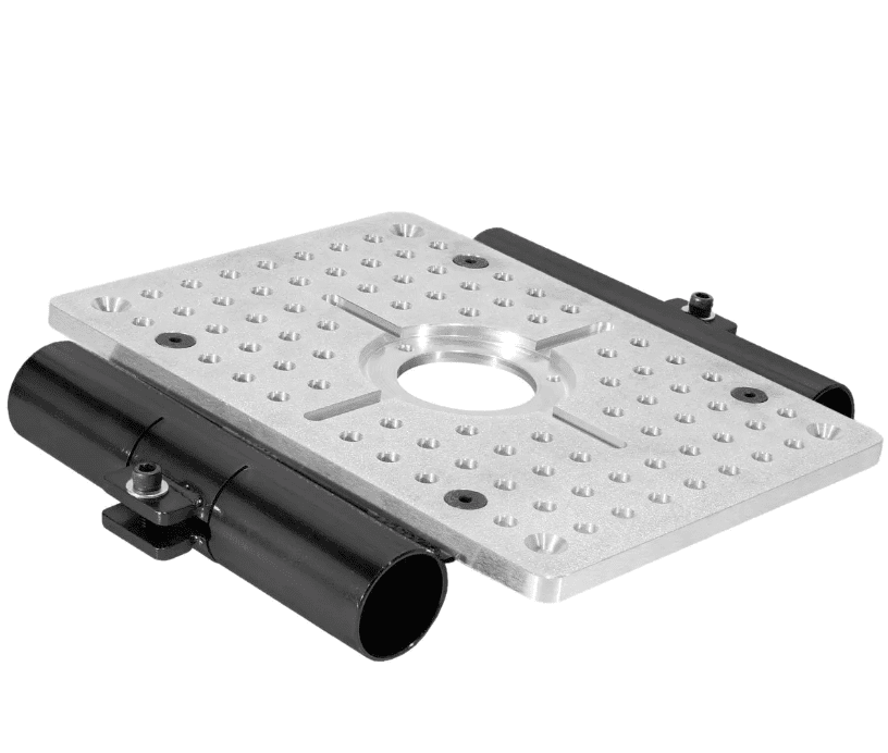 10" x 14" aluminum plate with 3/8" holes, spaced 1" on center. Features a standard mitchell hole in center. Comes with (2) 1-1/4" slider brackets used to clamp on to 1-1/4" Schedule 40 aluminum Speed-Rail®.