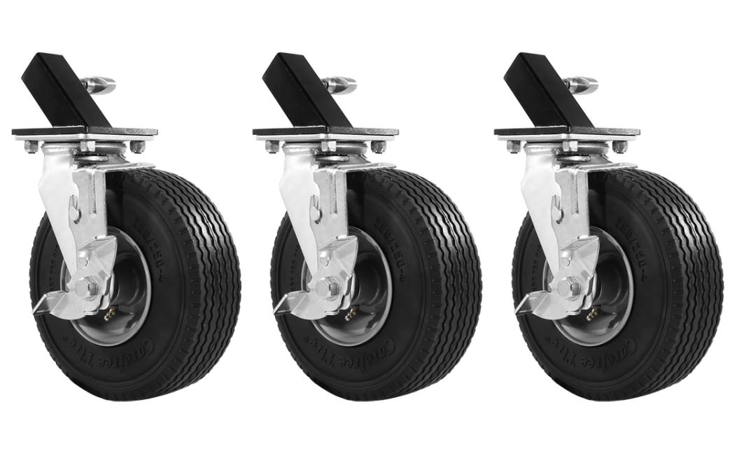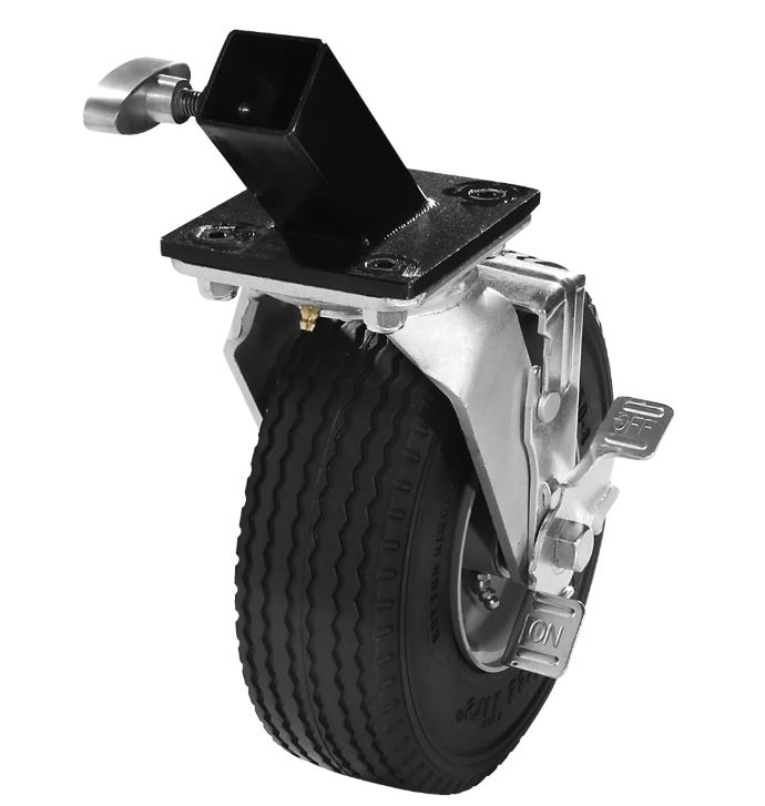 EZ Roller wheels come with 8" care-free (foam-filled) tires. The adapters are manufactured for all Mambo Combo stands that have a 1 1/4" x 1 1/4" leg. These wheels are perfect for use on rough terrain, grass, gravel, and asphalt. The EZ Roller's feature a strong and durable locking mechanism, ensuring ease of use.