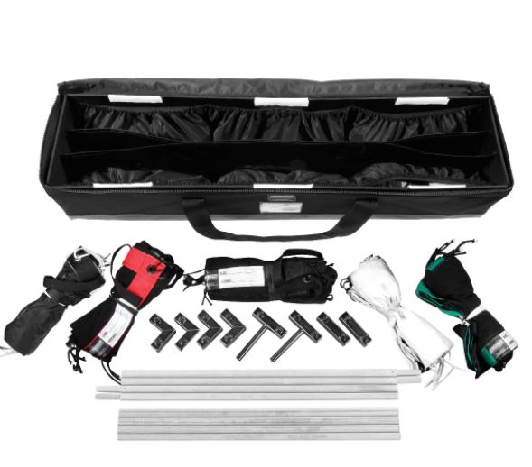 The Modern Studio 6x6 On the Go Butterfly Set provides large overhead fabrics and frame in a compact travel kit. The frame breaks down into 3ft lengths. Now you can have the advantage of a large, soft light source with included 6x6 white silk. The solid black 6' x 6' fabric can be used as a photographic background or to block light. The Single Net Scrim and Double Net Scrim can also be used as a background to reduce ambient light or to reduce direct sun light on falling on your subject. The 6x6 UltraBounce provides a large white fabric for bouncing light. All items are contained in a soft padded case.