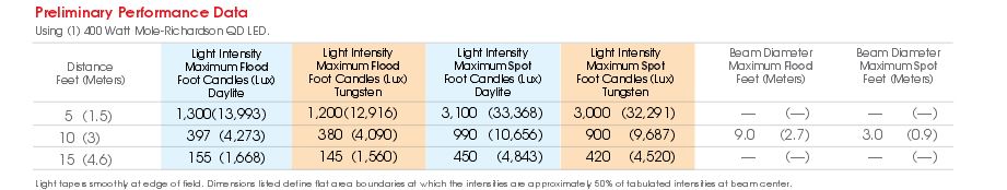 - Light Source: (1) - 400 Watt Mole-Richardson Quantum Dot LED