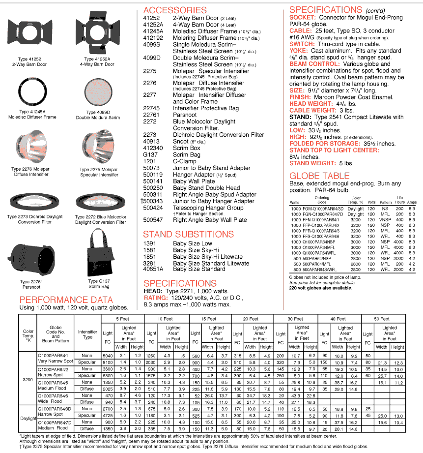 Nothing like a Mole Par 64 Light for extreme intensity and efficieny. Creates a punchy, sharp edged light source. Great for a real sunlight look or even bounce for a soft, diffused light. Uses standard Par 64 1000W and Par 64 500W bulbs available in different lens patterns including Spot, Medium, Medium Wide and Flood.