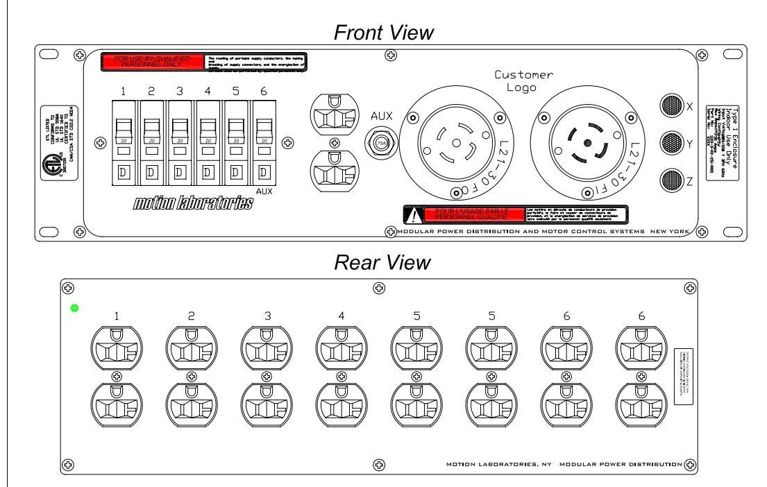 Rac Pac 3RU, L21-30 In/Thru, Aux Edison Duplex @15A-Front, 8x Edison Duplex-Rear, Chassis Depth 5.5, ETL Listed.