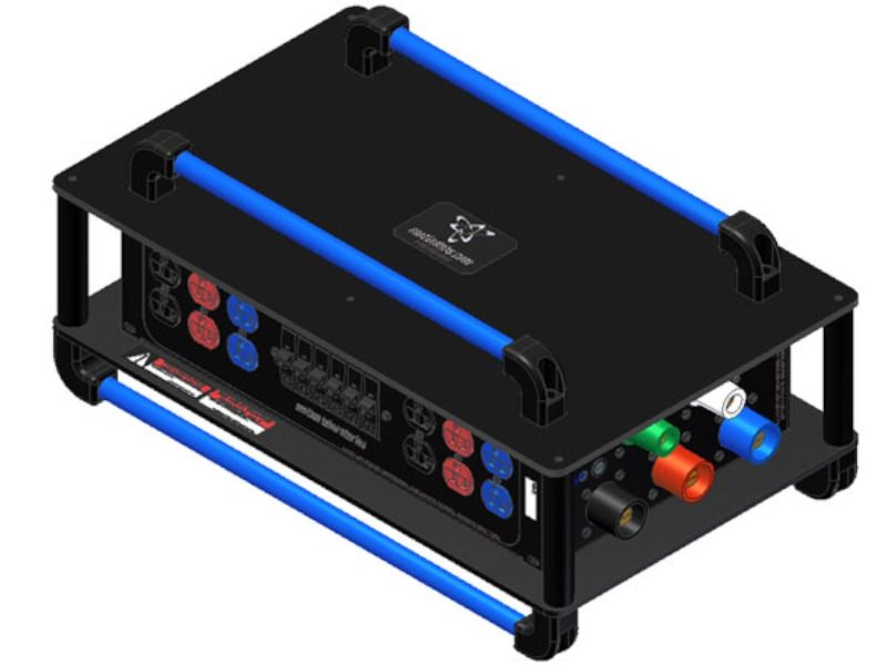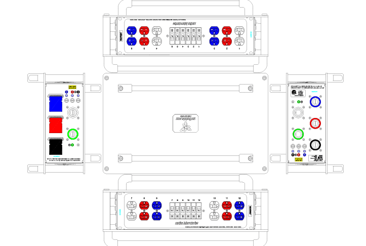 PDU Stackable, 5W CAM RGN In/Thru to 12 x Edison Duplex (BLK,RED,BLU) Color Coded to Phase, (Brkrd@20A) 23L x 14W x 16H
