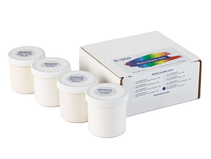 This kit of Rosco Scenic Products is designed for painters and students to explore different layering techniques for creating glazes and washes. The Clear Layers Set includes one 6 oz. jar of each of the following Rosco Scenic Products: