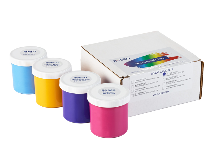 You can use a neutral white paint to lighten the hues created when mixing together the colors in this kit. Plus, a neutral white is also helpful for creating white clouds in the sky. We recommend pairing this Scenic Set with a quart of Off Broadway #5350 White scenic paint.