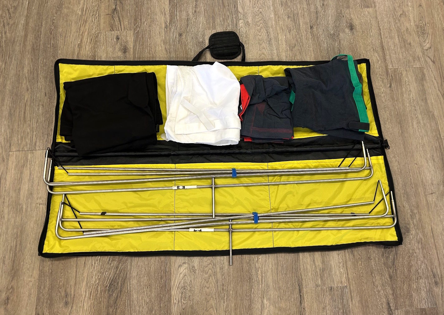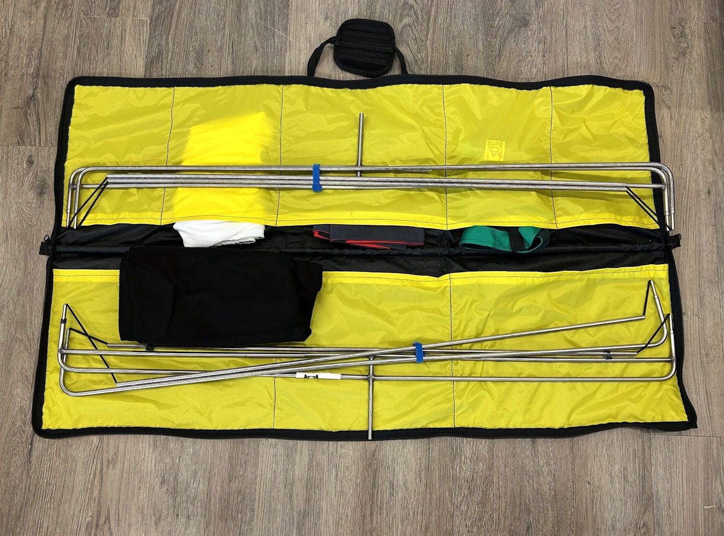 The 4x4 Flag Kits include frames made of 3/8 inch Stainless Steel tubing with Stainless Steel connector pins. An elastic cord keep all the pieces together even when collapsed. Bag contains a Stainless Steel tube sewn into the bottom to keep the bag rigid and allows the bag to be hung from the "T" handle on a stand. The bag is made of 1000 Denier Cordex black textured nylon, with a yellow polyester interior. Eight pockets (5 small, 3 medium) are provide to store Covers. A zipper securely keeps everything safe. Any 4x4 SLIPPER can be used on these frames.