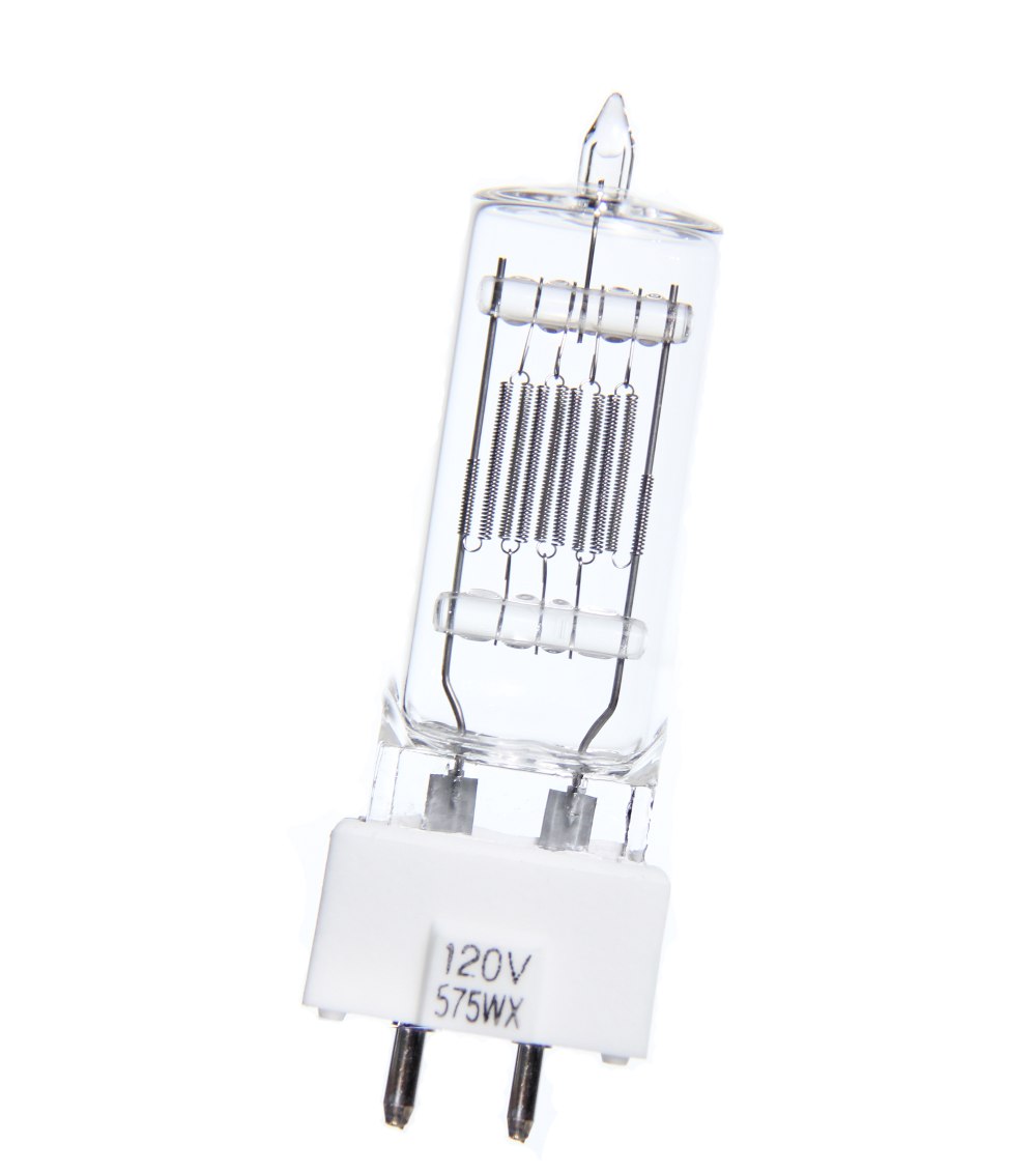 New 575 watt lamps from USHIO are designed as a medium wattage alternative to the FKW 300W and FRK 650W lamps used in theatrical fresnels. These medium wattage lamps allow for two instruments to be used on a 1200 watt capacity dimming channel while maximizing the light output. The Halogen capsule utilizes a bi-plane filament design, and incorporates a special gas mixture to prevent overheating and lamp darkening in smaller and hotter instrument designs.